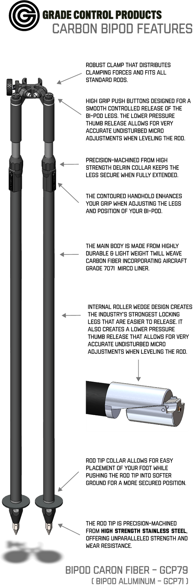 Grade Control Products Carbon Fiber Bipod features an Anti-Slip locking mechanism and a unique roller wedge design that creates the industry's strongest locking legs. Made from aircraft grade 6061 aluminum with an anti-crush clamp and high-grip push buttons.